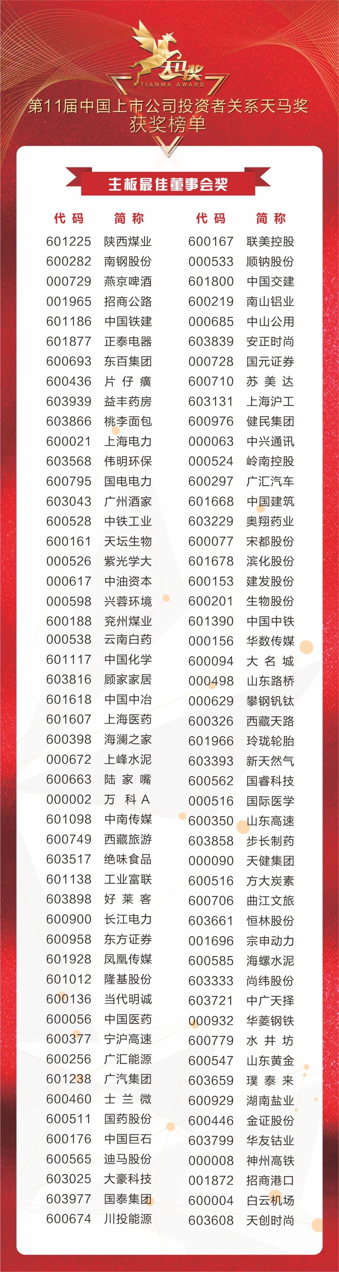 5月13日,由证券时报主办的“天马奖·第十一届中国上市公司投资者关系评选”榜单揭晓,兖州煤业荣获中国主板上市公司最佳董事会奖。本次“天马奖”面向3000多家上市公司,从诚信合规、规范运作、投资者回报、企业社会责任等方面进行全面考察,最终经上海证券交易所、深圳证券交易所审查,选出获奖企业和个人。