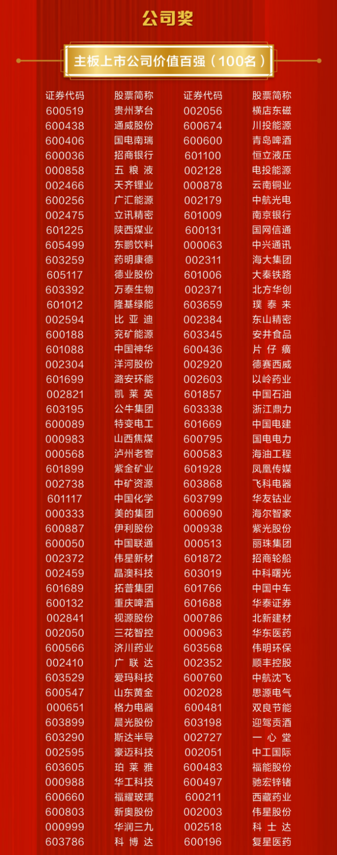 • 证券时报主板上市公司价值百强