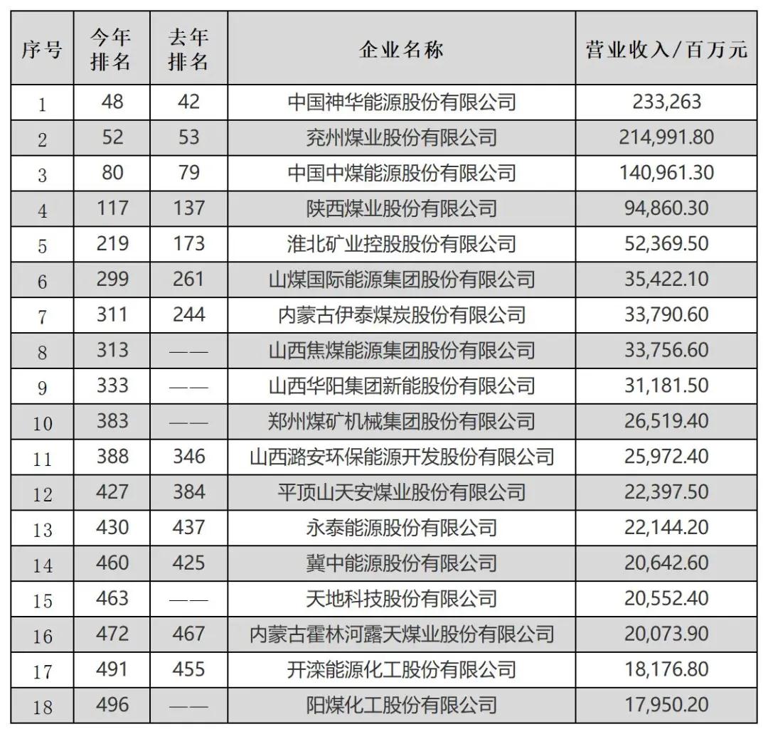 行业榜显示,煤炭行业有18家上市公司入围,总数比上年增加3家。其中,中国神华、兖州煤业、中煤能源继续位列三甲,排名入围前100名。